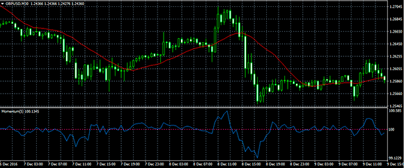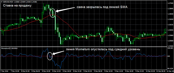 Торговая ставка на продажу осуществляется при закрытии котировочной свечи под мувингом SMA и пробое мувингом индикатора Momentum среднего уровня вниз и расположении под данным уровнем: