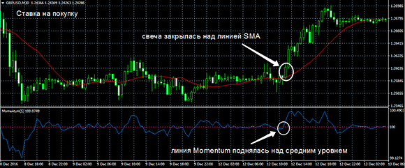 Формат использования стратегии «20 пунктов в день» является столь же простым, как и ее название. Торговая ставка на покупку осуществляется при закрытии котировочной свечи над мувингом SMA и пробое мувингом индикатора Momentum среднего уровня вверх и расположении над данным уровнем: