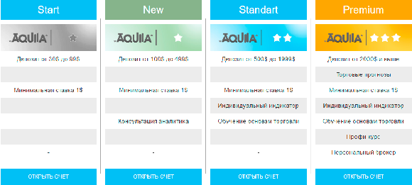 Компания Aqulla предлагает лояльные торговые условия – минимальный порог входа в рынок 30 долларов США, минимальная торговая ставка 1 USD. Таким образом, новички могут начать трейдинг не только с небольших капиталовложений, а и делать первые торговые шаги наименее рискованными суммами. Также данные финансовые параметры позволяют придерживаться в торговле правил манименеджмента и более безопасно применять множество рискованных торговых методик и математических приемов.