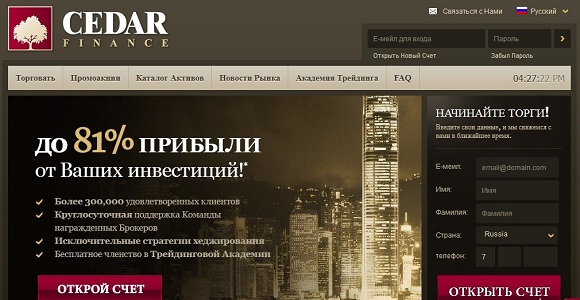 Теперь о брокере Cedar Finance – компания работает с 2013 года и предлагает клиентам довольно стандартные условия заключения сделок. Штаб-квартира расположена в городе Никосия, Кипр, как и подавляющее большинство коллег брокера. Отзывы о деятельности сравнительно новой компании в интернете найти достаточно сложно. По крайней мере, отзывов, которые бы подтверждали обратный вывод пользователями каких-либо денег с депозита этого брокера, автором статьи обнаружено не было.
