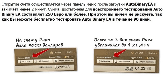 Участие пользователя сводится к простому получению сигналов и физическому проведению сделок, причем, производитель заявляет о поразительно высоком проценте (92,73%) успешных сделок заключены при помощи Auto Binary EA – это результат, якобы был получен в результате «долгосрочного тестирования».