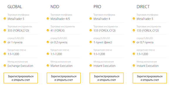 Итак, у брокера предлагаются следующие типы счетов: