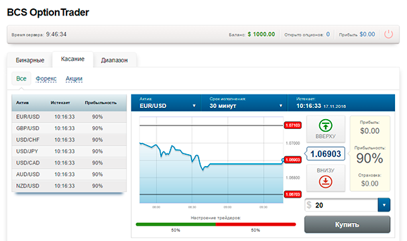Данный сервис доступен только для счета Direct.MT5, имея который можно авторизоваться на площадке BCS Option Trader. Для торговли предлагается довольно примитивная торговая платформа, на которой доступны классические бинарные опционы, Касание и Диапазон. Доходность контрактов может достигать 100% на одной торговой ставке. Торговать можно на 29 базовых активах, а срок экспирации для контрактов устанавливать из диапазона – 60 секунд – 4 часа. Данный сервис можно рассматривать только для формирования базовых понятий об опционном трейдинге, но не для стабильного получения прибыли.