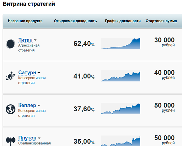 Это сервис доверительного управления, который позволяет зарабатывать до 180% прибыли от инвестированной суммы в год (процент дохода зависит от выбранного инвестиционного портфеля). Для использования сервиса нужно иметь на торговом счету не менее 10 тыс. рублей, что позволит вложить средства в одну из предлагаемых автоматических инвестиционных стратегий.
