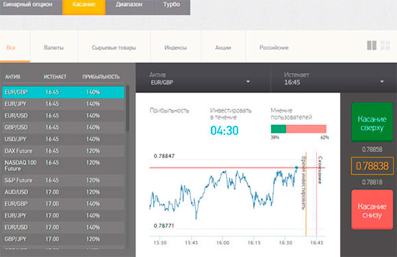 Брокер предлагает небольшое количество активов по каждому типу - валюты, акции, индексы и товары. Но поскольку представлены самые популярные, то в большинстве случаев трейдерам этого достаточно. Вы можете покупать бинарные опционы Call-Put, One Touch, диапазон, а также 60-секундные. Прибыльность по большинству опционов 75-80%, а по рискованным (One Touch и диапазонные) она может достигать 140%. Срок истечения опциона может быть любой - от минуты до месяца.