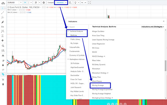 Теперь перейдите в раздел с индикаторами и два раза кликните на индикатор Moving Average:
