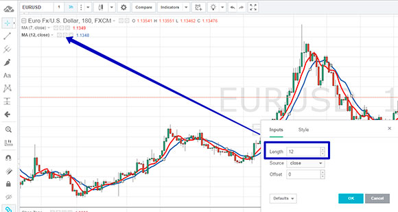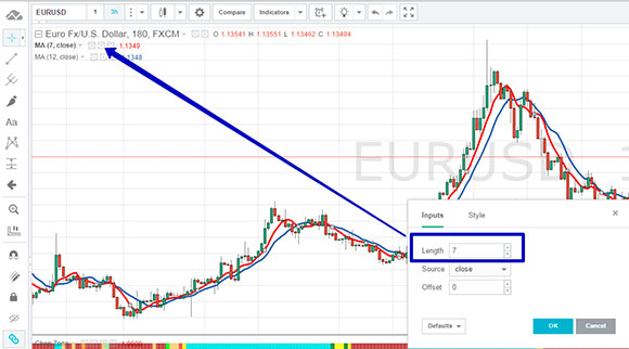 Добавив данные индикаторы на свой график, выберите для них период длинны «7» и «12», открыв для этого их настройки: