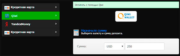 Оператор предлагает использовать для ввода и вывода средств банковский перевод, кредитные и дебетовые карты, а также электронные платёжные системы Киви и ВебМани, PayPal, Skrill и Neteller.