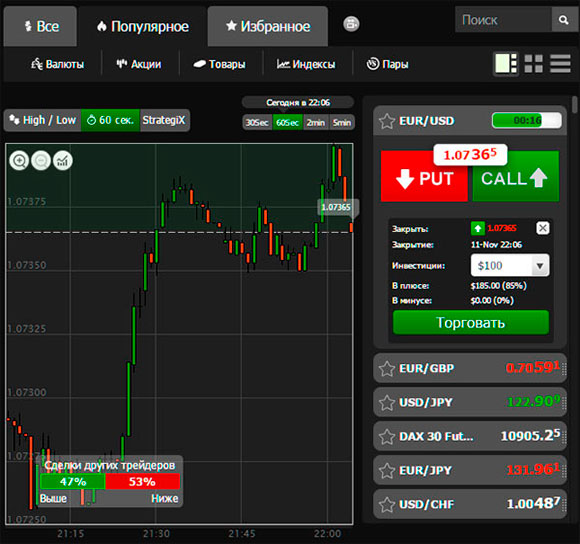 Компания предлагает торговлю большим количеством базовых активов, прибыльность сделки может достигать 350%, но наиболее популярные опционы имеют прибыльность 70-85%.