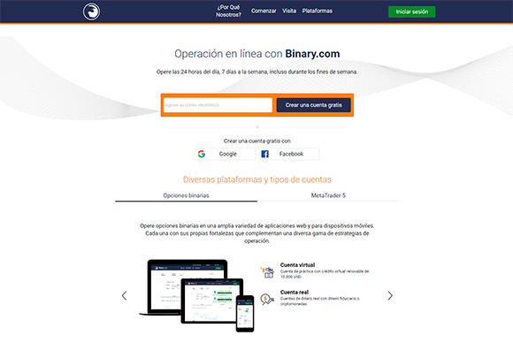 La creación de cuentas en Binary.com es gratuita, y la manera de hacerlo es bastante sencilla e intuitiva, pues es lo primero que aparece en la página principal.
