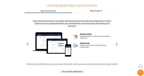 - La plataforma de opciones binarias, para operaciones sencillas de sí o no, con un pago fijo, tiene una cuenta virtual y una cuenta real.
