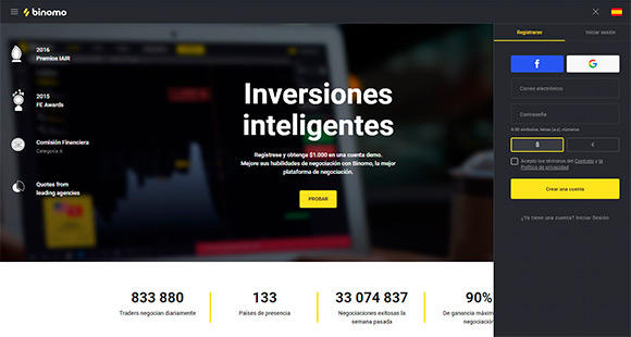 La creación de cuentas es muy sencilla; al momento de registrarse en Binomo, la página da tres opciones diferentes. Estas opciones son: