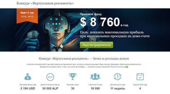 Альпари – один из немногих форекс-брокеров, который проводит конкурс с трейдерами, открывшими тренировочны депозит. Он называется «Виртуальная реальность» и предусматривает призовой фонд с суммой от 2000 долларов США, которая распределяется между 30 лидерами. Цель конкурса – показать на демо-счете максимальную доходность при минимальных просадках. Победители получают реальный счет с бонусными средствами, вывести которые нельзя, но на которые можно торговать (а вот прибыль выводится без проблем). Так что трейдер может совместить приятное с полезным – и научиться работать с брокером, и выиграть реальные деньги.