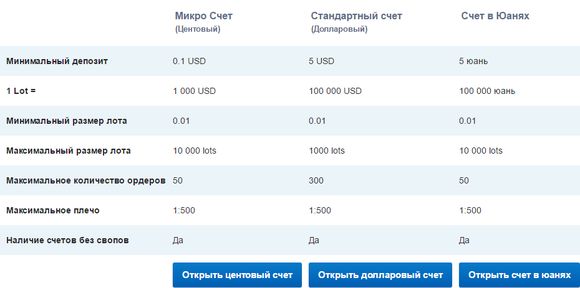 Итак, дилер предлагает на выбор счета классического и центового типа. Безусловно, центовый аккаунт будет интересен начинающим трейдерам, которые после торговли на демо-счете пока не готовы рисковать серьезными деньгами. Также центовый счет будет интересен трейдерам, которым нужно протестировать нового советника или стратегию. Открыть микро-счет у брокера можно с 10 центов. Также доступен классический счет в двух валютах – доллар США и юань, который можно открыть от 5 USD/CNY. Если вас интересуют еще брокеры с минимальныйм депозитом менее 10 долларов США, то рекомендуем ознакомится с Forex4you, Alfa Forex, Forex Club и Alpari.