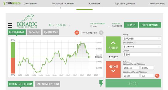 Для любителей разнообразить онлайн-трейдинг новым инструментом данный оператор предлагает бинарные опционы в сервисе Fresh Options. Для торговли предлагаются 3 типа опционов: ВЫШЕ/НИЖЕ, Касание и Диапазон, сроки экспирации в рамках 1 минута – 1 час и доходность до 86% на одной сделке. Также брокер предлагает до 15% возврата суммы с неудачной сделки и хорошую подборку торговых активов. Минимальная стоимость контракта – 1 доллар США, минимальный депозит – от 10 американских долларов.
