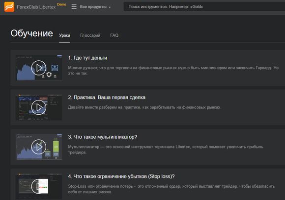 Начало работы и обучениеFxClub Libertex представляет собой стильную торговую платформу, которая выполнена в темной цветовой гамме. Интерфейс платформы полностью русифицирован и интуитивно понятен, впрочем, для совсем «зеленых» трейдеров компания предлагает дополнительное обучение по совершению торговых операций в виде расширенного глоссария и 23 видеоуроков: