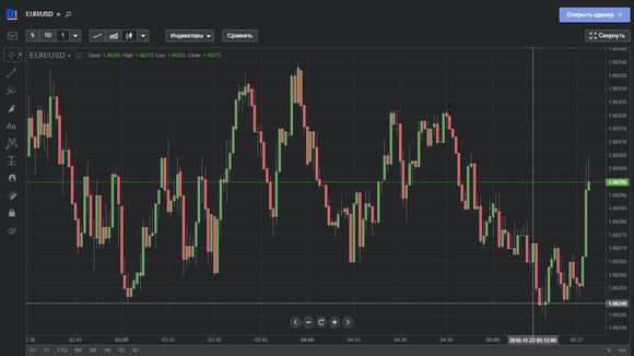 Для торговли предлагается более 120 торговых инструментов – 54 валютные пары, драгметаллы, 72 CFD акций и индексов, а также криптовалюта. Торговый график котировок терминала можно назвать вполне информативным – он оборудован различными таймфреймами, функцией масштабирования и возможностью изменения формата отображения цены актива – линия, зона, японские свечи.