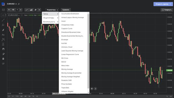 Кроме того, торговая площадка оборудована хорошим набором технических индикаторов из более 45 наименований, которые легко выбираются с помощью одноименной клавиши. Здесь представлены сразу три категории индикаторов: