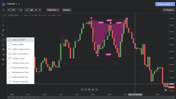 Отдельно внимания стоит также набор графических инструментов, где кроме классических функций (трендовые линии, каналы, уровни Фибоначчи), предлагается также дополнительный инструментарий для идентификации графических фигур в виде отдельных шаблонов: