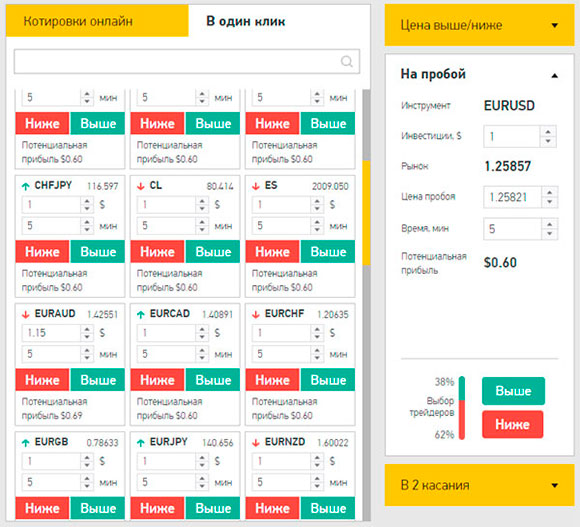 Платформа предлагает торговать не только бинарными опционами, но и на Форексе. А бинарники здесь делятся на 2 вида: американские (с функцией досрочного закрытия) и европейские (с более высокой прибыльностью). Вы можете приобретать опционы Call-Put, в 2 касания и на "пробой".