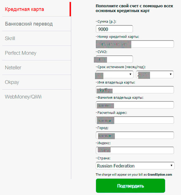 Для вывода средств с платформы Гранд Опшн, вам потребуется предоставить документы, удостоверяющие личность. Вывод средств осуществляется быстро, но иногда может занимать до 7 дней. Сумма комиссии зависит от типа вашего счёта и от того, какими способом вы выводите деньги. В зависимости от этого она может варьироваться от 0 до 3%.