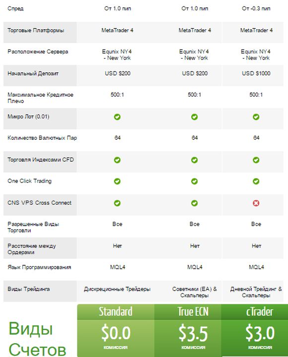 Сразу отметим, что оператор работает по NDD бизнес-модели и открывает доступ к ECN среде, то есть, не имеет ничего общего с «кухней». На каждом типе торгового счета, которых всего три – Standard, True ECN, cTrader, предлагаются одинаково лояльные торговые условиях, как для частных трейдеров, так и для институциональных клиентов. При этом счета можно открыть в одной из 10 валют: