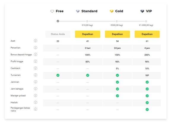 Untuk akun ini, Anda mendapatkan yang terbaik dari apa yang ditawarkan Binomo. Anda harus menyetor minimal $ 1000 ke akun ini. Anda mendapatkan pembayaran sangat cepat atas keuntungan yang diminta yang hanya membutuhkan 4 jam untuk diproses. Anda dapat menikmati 60+ aset berbeda saat Anda menempatkan trading Anda yang meningkatkan peluang Anda untuk menghasilkan keuntungan dari investasi Anda.