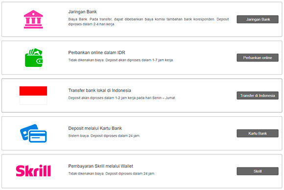Metode yang bisa digunakan untuk membiayai akun trading Anda antara lain dengan kartu bank, transfer antar bank, Payco, Skrill, Neteller, UnionPay, WeChat, transfer bank Asia Tenggara, Alipay, Ngangluong Bank, Ngangluong Wallet, Carta Bleue, CartaSi, Dankort, ePay.bg, EPS, iDeal, GiroPay, Maestro, POLi Payments, Nordea SOLO, PostePay, Bitcoin, Trustly, Sofort, dan Litecoin.