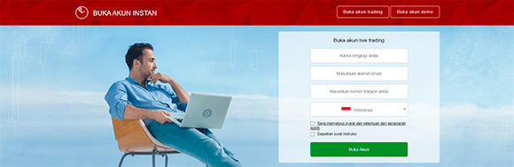 Ketika sudah memuat situs webnya, gulirkan halaman Beranda ke bawah dan klik ‘Buka Akun Demo’. Isikan semua detail yang diminta kemudian dapatkan sebuah nama pengguna dan kata kunci. Gunakan keduanya untuk masuk ke dalam akun demo dan memulai trading.