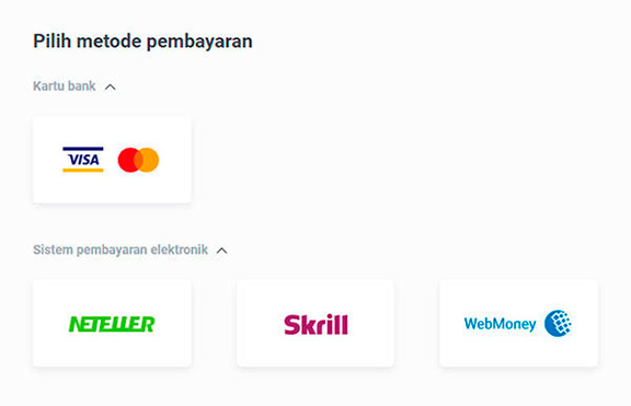 Melakukan deposit atau penarikan di Olymp Trade cukup mudah dan tepat. Jika Anda ingin menikmati transaksi yang cepat di platform ini, disarankan untuk menggunakan e-wallet. Juga, untuk menikmati layanan ini tanpa kesulitan, pastikan akun trading Anda sudah diverifikasi sepenuhnya. Di bawah ini adalah opsi pembayaran dan batas minimum dan maksimumnya.