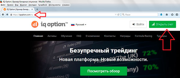 Итак, рассмотрим, как происходит открытие демонстрационного счета у брокера бинарных опционов IQ. Для начала необходимо открыть официальный ресурс брокера и активировать большую зеленую кнопку «Открыть счет» (в верхней правой части главной страницы сайта).