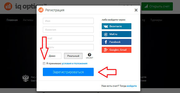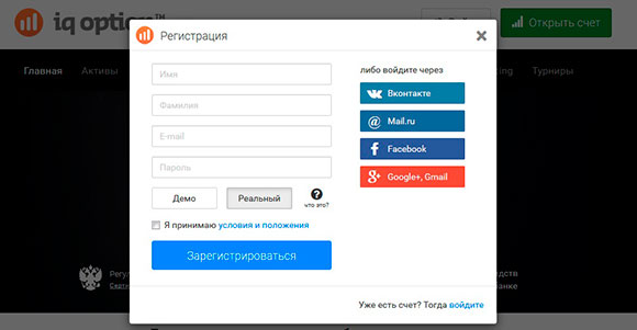 Для регистрации демо-счета на IQoption.com можно использовать аккаунты социальных сетей и почтовые аккаунты (Вконтакте, Facebook, Mail.Ru или Google+). Однако в этом случае брокер запрашивает доступ к некоторой личной информации.