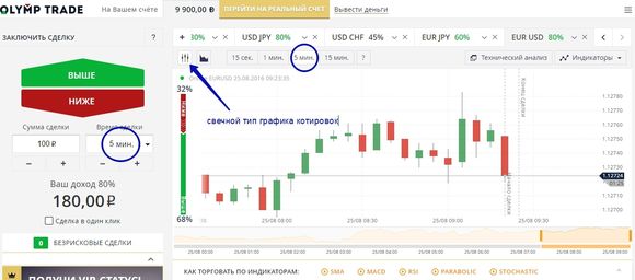 Итак, для применения данной стратегии необходимо установить график котировок на свечной тип отображения и на 5-минутный интервал, а время экспирации сделки – на 5 минут: