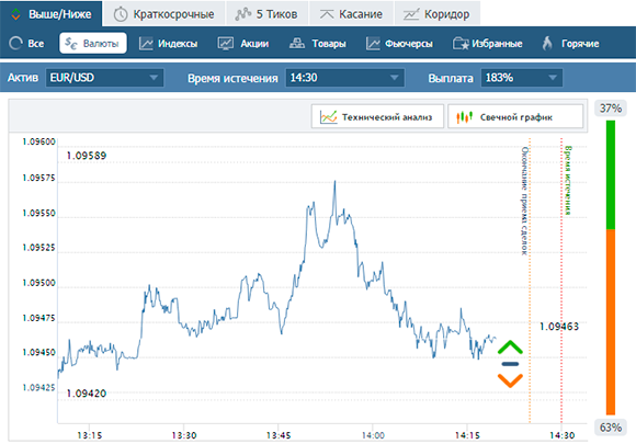 Процент выплат показывается не совсем привычно, так 180% означает, что на выходе выигрышной сделки вы получите 100% за вложенную сумму и 80% сверху нее. Это то же самое, что 80% на платформах других компаний.