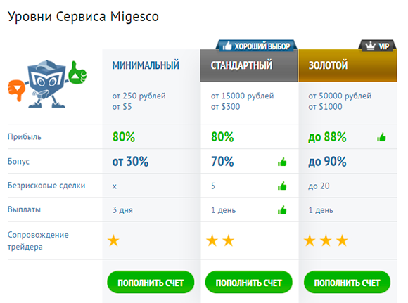 Migesco – это компания, предоставляющая доступ к опционной торговле с 2011 года, центральный офис расположен в Лондоне. При этом оператор уделяет большое внимание тому, чтобы быть комфортным именно для российских трейдеров. По этой причине есть возможность пополнять счёт и выводить свои деньги в рублях. Минимально возможное пополнение счета составляет 250 рублей, а минимальная цена сделки 60 рублей.