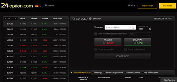 Existem mais de 100 ativos que podem ser negociados na 24 Option. Commodities, Mercado de Divisas (Forex), Criptomoedas, Ações e índices.
