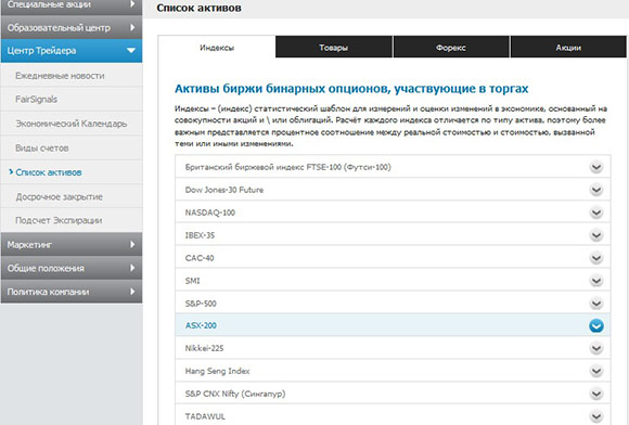Компания предлагает целый ряд волатильных активов, контракты по которым сулят неплохую прибыльность. Базисные активы, которые лежат в основе опционных контрактов, представляют довольно внушительный список, включающий: