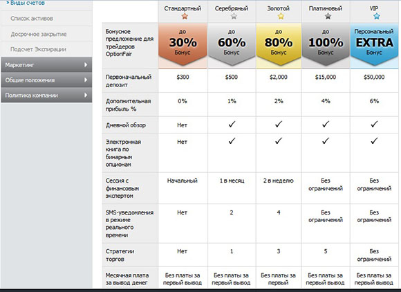 Брокер предлагает систему поощрения клиентов, которая имеет вид градации по видам счетов. Общий смысл заключается в соотношении размеров вложений (объемов операций) и дополнительном проценте выплат при удачных сделках. Кроме того, держателям премиальных счетов предлагается набор преференций.