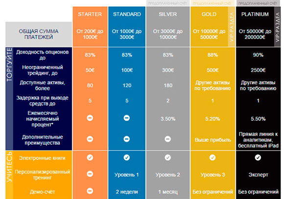 Компания предлагает продвинутым трейдерам с большим депозитом увеличение максимальной доходности опционов до 90%, а это очень высокий уровень. Также вы сможете получать проценты от совершённых вами за месяц сделок на свой депозит, а это хорошая прибыль для тех трейдеров, которые совершают значительный объём сделок на большие суммы.