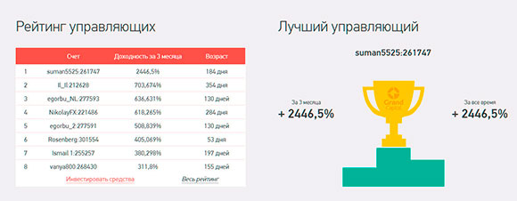 - выбирается трейдер-управляющий. Чтобы инвестору было проще выбирать, обычно компания составляет рейтинг управляющих. Каждый из них выставляет свои условия сотрудничества, которые требуется изучить.