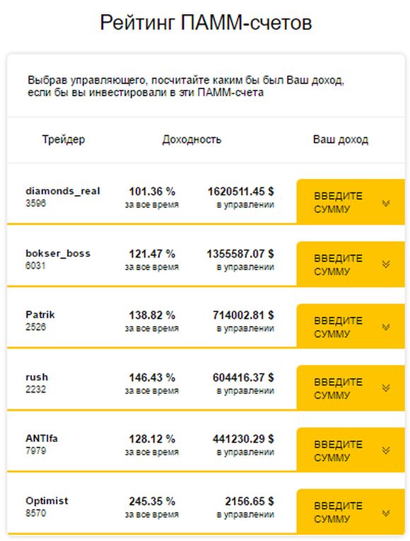 Начнем с классического инвестиционного решения – ПАММ-счета, деньгами инвесторов на котором управляет профессиональный форекс-трейдер. Данный счет предполагает пропорциональное разделение прибыли между вкладчиком и менеджером по заранее оговоренным в оферте условиям. Для применения сервиса в качестве инвестора понадобится от 20$, которые можно вложить на период от 1-ой недели.