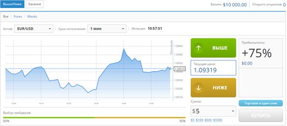 В качестве альтернативы форекс-торговле, компания предлагает трейдинг бинарными опционами (читайте как он устроен) на терминале BinaryTrader. Для торговли предлагается два типа контрактов – классические ВЫШЕ/НИЖЕ и Касание, экспирация сделок в диапазоне 1 минута – 4 часа, и доходность на одной сделке до 75%, что не очень щедро, по сравнению с другими форек-дилерами, которые уровень выплат по опционам поднимают до 90%.