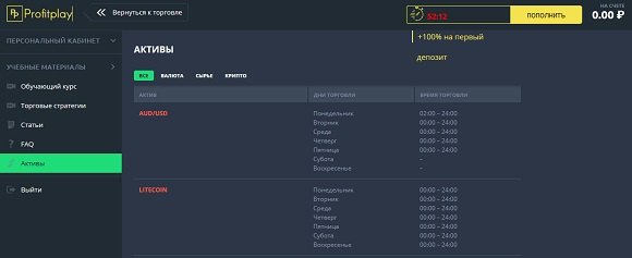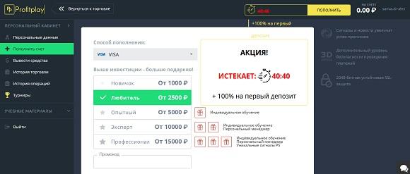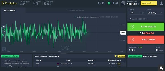 Profitplay является продвинутой брокерской площадкой, которая помогает трейдерам получать прибыль от колебания котировок на активы. Широкий функционал платформы предоставляет весь необходимый инструментарий для успешного обучения и реализации сделок, а отзывчивая служба клиентской поддержки всегда готова прийти на помощь как начинающему трейдеру, так и профессионалу в сфере бинарных опционов.