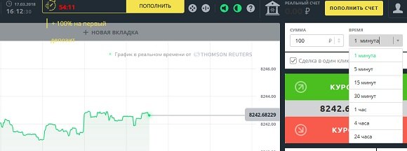 Данная брокерская площадка предлагает лишь «классическую» разновидность бинарных опционов - Call / Put. Однако время истечения контрактов можно варьировать в достаточно широком диапазоне. При осуществлении процесса торговли применяются так называемые турбо-опционы (контракты с коротким сроком экспирации), время «жизни» таких договоров составляет от 1 до 5 минут. Долгосрочные контракты в рамках данной площадки можно заключать на срок от 30 минут до 24 часов.