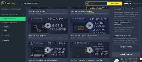 Платформа Profitplay не оставляет новичков в океане трейдинга без должной поддержки. В качестве спасательного круга выступают обучающие текстовые и видеоматериалы, предоставляемые брокером. В специальном разделе «Статьи» на официальном ресурсе Profitplay можно найти интересные и полезные наработки, где речь идет, помимо прочего, о различных стратегиях трейдинга и возможностях снижения рисков. На «Профитплей» также размещаются новости из области финансов, оповещающие трейдеров о последних тенденциях.