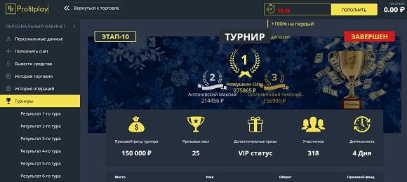 Кроме того, Profitplay проводит турниры трейдеров, участники которых могут рассчитывать на солидный приз. Информация о времени и условиях предстоящего турнира присутствует на отдельной странице (пункт меню «Турниры»).