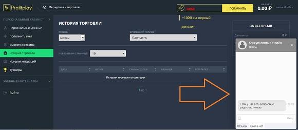 Если у пользователя в процессе работы на Profitplay возникнут какие-либо вопросы, он в любое время может связаться с представителями службы технической поддержки сервиса, работающей в режиме 24/7. Сделать это можно посредством чата (кнопка вызова окна чата присутствует в правом нижнем углу) или с помощью телефонного звонка (есть бесплатный номер для жителей РФ). Все контактные данные для связи указаны на официальном сайте брокера в разделе «Контакты».