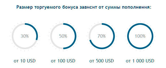 Если вы пополняете свой депозит в системе брокера, то можете рассчитывать на получение бонуса. Он начисляется на счет сразу после того, как вы его пополнили, а сумма бонуса зависит от суммы депозита. Вывести бонусные средства возможно будет после того, как вы совершите определённое количество сделок.