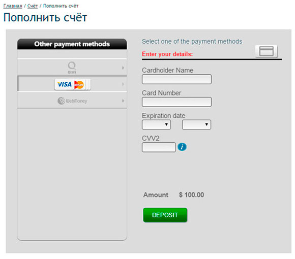 Минимальная сумма пополнения всего 10 долларов США или евро, как и минимальная сумма, которую можно заказать на вывод из системы. К сожалению отсутствует рублёвый счёт, пополнить депозит можно только в долларах США или евро.