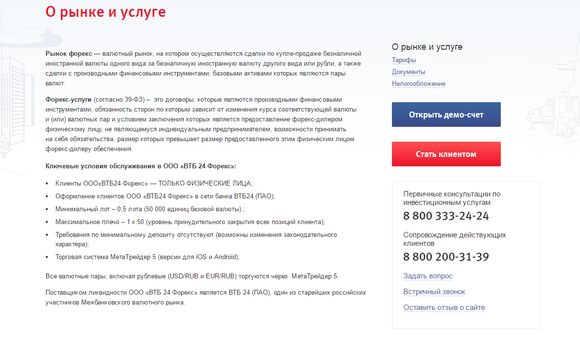 Компания ВТБ 24 Форекс входит в банковскую группу ВТБ. Поставщиком ликвидности для этого оператора является ПАО ВТБ24, аналитическую поддержку оказывают специалисты группы. Все счета открываются в одноименном банке, клиент имеет право открыть обычный брокерский или индивидуальный инвестиционный счет со всеми полагающимися налоговыми привилегиями.